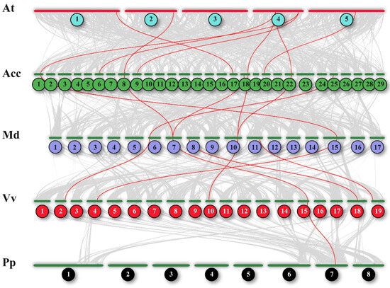 Synteny analysis of BES1 genes between Arabidopsis thaliana (At), Actinidia chinensis (Acc), Malus domestica (Md), Vitis vinifera (Vv), and Prunus persica (Pp). The gray lines in the background indicated the collinear blocks within rice and other plant genomes, while the red lines highlight the syntenic BES1 gene pairs. The green bars represented the chromosomes. The chromosome number is labeled at the top or bottom of each chromosome.