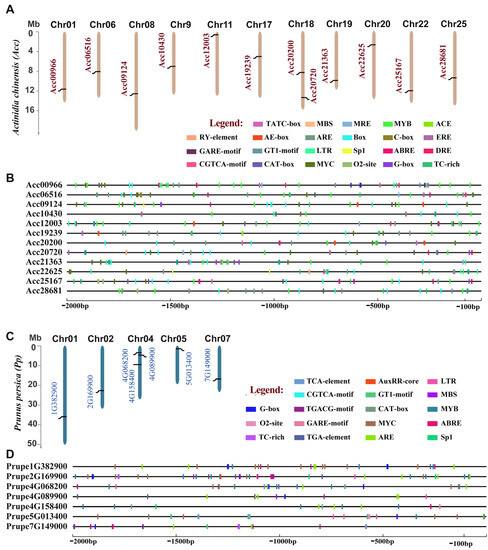 The illustration of Chromosomal locations (A,C) and predicted cis-elements in the promoter regions (B,D) of BES1 genes in kiwifruit and peach. In (A,C), chromosome numbers were shown at the tops of the bar; BES1 genes were labeled at the sides of the chromosomes; The scale bar on the left indicates the chromosome lengths (Mb). Predicted cis-elements in the promoter regions of the BES1 genes (B,D). In (B,D), all promoter sequences (−2000 bp) were analyzed. The BES1s were initiated on the left side of the lines. The scale bar at the bottom indicated the length of the promoter sequences.