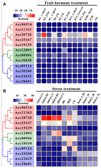 The RNA-seq data was used to analyze the gene expression of kiwifruit and peach. Large-scale expression datasets of various hormone treatments, developmental and postharvest stages, and adversity were obtained from the SRA database of the NCBI. We collected 70 samples, including the expression data of different tissues of kiwifruit as well as different development periods of fruit from growth to postharvest storage [34,35]. Data from 45 transcriptome samples of kiwifruit during postharvest storage treated with ethylene (ETH) and 1-methylcyclopropene (1-MCP, an ethylene inhibitor) were obtained from SRA (accession numbers: PRJNA638129, PRJNA445209, and PRJNA593865). A total of 37 transcriptome samples of biological and abiotic stress were from SRA (accession number: PRJNA602928, PRJNA726005, and PRJNA681641). Specifically: the biological stress data of kiwifruit infected with Botrytis cinerea inoculated; Secondly, expression data of kiwifruit roots stressed by brassinolide hormone and Brassinazole (BRZ, a brassinolide inhibitor); Finally, the transcriptome expression data of kiwifruit subjected to low-temperature stress were analyzed. The gene expression values were normalized as fragments per kilobase of transcript per million mapped reads (FPKM) [36]. The R language was used to demonstrate Heatmaps of gene expression.