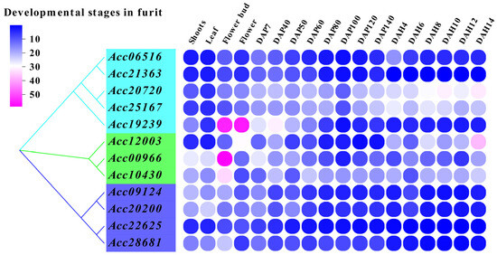 To evaluate the tissue specificity of members of the BES1 gene family, we constructed expression profiles in different tissues and fruit development stages. The results (Figure 6) indicated that different family members were diverse in expression levels in different tissues (roots, stems, leaves, flowers, and fruits). Therefore, two BES1 genes (Acc19239 and Acc00966) were significantly overexpressed in flower buds, three BES1 genes (Acc20720, Acc25167, and Acc10430) were specifically expressed during fruit development. These results indicated that different members of the BES1 gene family of kiwifruit play different functions in different tissues and development stages and participate in the growth and development of plants.