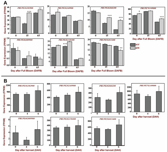 BES1 gene expression in peach development (A) and postharvest stages (B) in the one round (HY) and one flat (ZH) peach cultivar. Data represented the average FPKM value of three independent experiments + SD. Standard errors are shown as bars above columns. Error bars show the standard deviation of the three replicates, and the asterisk indicates a significant difference. (Student’s t-test; * p < 0.05; ** p < 0.01; *** p < 0.001.).