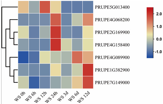 According to the analysis of gene expression patterns of BES1 family members in peaches under water stress conditions (Figure 8), about 57% of genes respond in the early stages of water stress, mainly reaching their peak expression at 24 h. The expression levels of other genes were higher on the 6th and 12th days after stress. The different expression patterns in response to stress indicate that BES1 members play different functions under water stress.