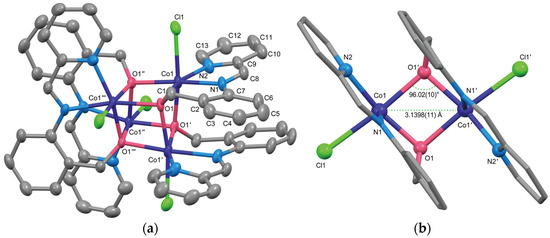 (a) Crystal structure for 1, showing thermal ellipsoids at a 50% probability level. Hydrogen atoms are omitted for clarity. Symmetry Code: (′) 1 − x, 3/2 − y, +z; (″) 5/4 − y, 1/4 + x, 5/4 − z; (‴) −1/4 + y, 5/4 − x, 5/4 − z. (b) Structure of the dinuclear unit viewed from the Co2O2 plane.