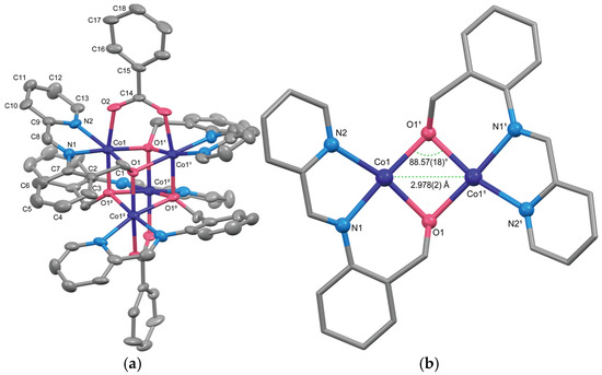 (a) Crystal structure for the complex cation of 2, showing thermal ellipsoids at a 30% probability level. Hydrogen atoms are omitted for clarity. Symmetry code: (1) 1 − x, 2 − y, +z; (2) 3/2 − y, 1/2 + x, 1/2 − z; (3) −1/2 + y, 3/2 − x, 1/2 − z. (b) Structure of the dinuclear unit viewed from the Co2O2 plane, with the benzoate ligand omitted for clarity.