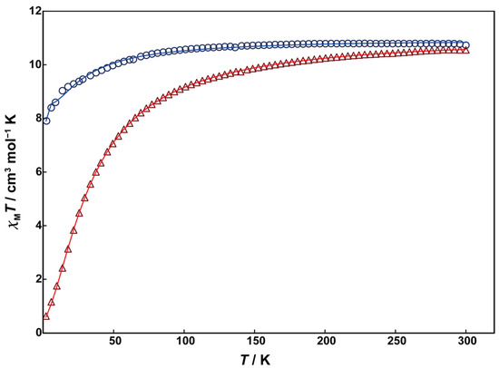 Temperature dependence of χMT vs. T plots of 1 (blue circles) and 2 (red triangles). Solid lines are drawn with the best-fitted parameter values described in the text.