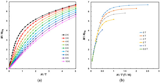 Magnetization plots for 1. (a) M vs. H plot in the temperature range of 2 to 10 K; (b) M vs. H/T plot in the field range of 0.5 to 5 T. Solid lines are guides for the eye.
