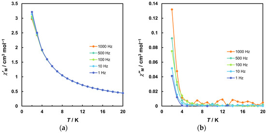 Frequency-dependent alternating current (AC) magnetization measurements were performed at frequencies of 1, 10, 100, 500, and 1000 Hz (Figure 8a,b). In the absence of a static DC field, only subtle out-of-phase (χ″M) signals were detected (Figure S8). However, when an external magnetic field of 2000 Oe was applied, the χ″M component exhibited a significantly larger response and a more pronounced frequency dependence below 5 K, indicating field-induced slow magnetic relaxation. The χ″M responses are similar to those for reported complexes as weak SMMs [22,27,47].