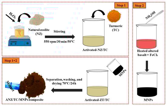 In the first step, Fe3O4 nanoparticles (MNPs) were formed using activated altered basalt via the precipitation process outlined in [34]. In a beaker with 30 mL deionized water, 0.75 g of FeCl2 and 1.5 g of heated altered basalt powder were combined. Then, 10 mL of NH4OH was added and the mixture was stirred until the precipitation of MNPs with a black color. In a separate step, 15 mL of H2O2 was added to a second beaker that contained 25 mL of distilled water and 2.0 g of NZ with continuous stirring for 2 h at 40 °C. The H2O2/NZ mixture (ANZ) was then combined with 1.0 g of cleaned and dried TC with stirring for 3 h. The MNPs from the first stage and the ANZ/TC of the second step were then mixed for 3 h at 25 °C. Using an external magnet, the induced magnetic ANZ/TC/MNPs adsorbent was separated. It was then repeatedly cleaned with distilled water and baked for 24 h at 70 °C in an oven. After being created, the fabricated composite was carefully ground in agate mortar and kept for analyzing and MB adsorption examinations. Figure 1 shows the processes needed to prepare the ANZ/TC/MNPs adsorbent.