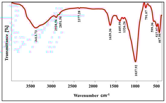 The FTIR spectrum of ANZ/TC/MNPs shows a variety of absorption bands (Figure 3). The bands observed at 3413.73 and 1639.36 cm−1 are associated with water molecules, which represent the existence of physically adsorbed water within the studied sample [38]. The asymmetric stretching of Si–O or Al–O is associated with the vibration at 1037.92 cm−1, whereas the Fe–O functional group of Fe-bearing minerals is linked to the bands found at 467.06 and 599.36 cm−1 [34]. The bands observed at 791.07 cm−1 and 1326.26 cm−1 are related to Al–O–Al and water of NZ, respectively [11,26]. Additionally, the detected peaks at 2851.56 and 2928.56 cm−1 are related to the C–H bonds stretching [39].