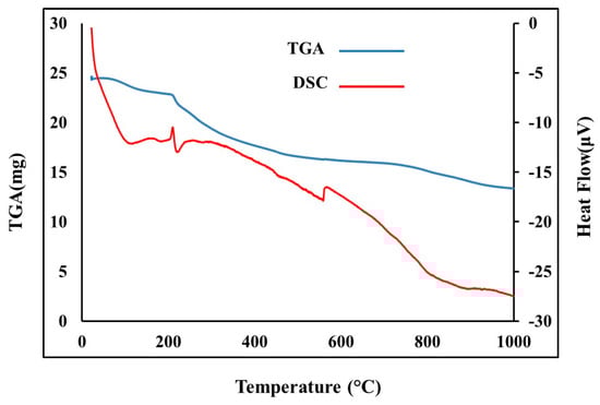 For the studied ANZ/TC/MNPs adsorbent, the TGA curve shows two notable weight loss events that happen at different temperature ranges (Figure 5). The TGA analysis indicates an initial minor weight loss (1.72% at a temperature below 200 °C, which is likely attributed to the evaporation of mechanically bound water and elimination of other impurities [42]. In the second phase, a weight loss (~7.86%) is observed within the temperature range of 200–600 °C, which could be related to the oxidation of organic components and the degradation of the hydroxyl (-OH) groups in the ANZ/TC/MNPs structure [43]. The last stage of weight loss (600–800 °C) is assigned to the release of oxygen during the oxidation of Fe3O4 to form the hematite phase and the complete decomposition of the developed ANZ/TC/MNPs adsorbent [21,42]. Furthermore, the DSC curve reveals three prominent peaks. The first peak, which is observed between 100 and 150 °C, is likely related to the evaporation of H2O molecules. The release of organic matter and chemically held water from the ANZ/TC/MNPs composite may be the reason of the second peak, which occurred between 200 and 600 °C. The final peak, around 600–800 °C, is associated with the comprehensive dehydroxylation of zeolite and the formation of hematite (Fe2O3) mineral [42]. Overall, the TGA and DSC findings demonstrate the high stability of ANZ/TC/MNPs adsorbent until 600 °C.