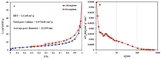 The nitrogen adsorption–desorption measurements of ANZ/TC/MNPs and BJH pore sizing distributions are presented in Figure 5. Based on the International Union of Pure and Applied Chemistry (IUPAC) category [44], the ANZ/TC/MNPs exhibits a type IV isotherm plot featuring an H3 hysteresis curve observed in the 0.3–1 range. This hysteresis loop represents the mesopore structure of the developed ANZ/TC/MNPs composite with the existence of slit-like pores and cylindrical pores [45]. The specific surface area and the average pore diameter of ANZ/TC/MNPs were 13.148 m2/g and 21.859 nm, respectively (see Figure 6). The pore size distribution function obtained by BJH-model (Figure 6b) was found to be around 13.647 nm. This distribution can improve the pores’ accessibility, which makes it easier for MB molecules to diffuse and interact throughout the adsorption processes.