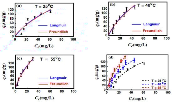 The adsorption isotherms of MB, with changing the initial solution concentration (, 25–200 mg/L), were confirmed at a solution pH value of 8.0 and temperatures of 25, 40, and 55 °C.