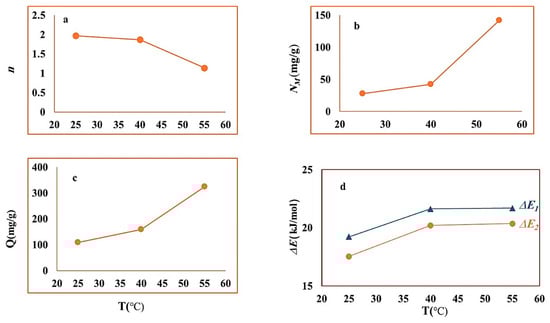 Since statistical advanced models involve a number of steric and energetic components, their application is generally crucial to comprehending the adsorption behavior. The position of dye molecules and the molecular-scale interaction mechanism can be clearly seen by interpreting these physicochemical parameters at each temperature. It is crucial to clarify that these details cannot be provided by the parameters that arrived from the classical models. The results of the R2 and RMSE calculations for the values given in Table S1 showed that the double-layer model with two adsorption energies (Model 2) fitted the MB adsorption data well (i.e., R2 > 0.99 and RMSE ranged from 0.78 to 1.35). Thus, using the double-layer model, the n, NM, and Qsat (steric) and ΔE (energetic) parameters were computed and analyzed. As previously indicated, the Supplementary Materials present the assumptions for these models as well as the identification of the related parameters [21,34].