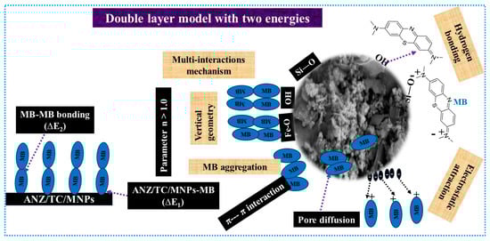 The values of the MB adsorption energies in relation to each solution temperatures are shown in Figure 9. At all temperatures, the ΔE1 and ΔE2 were positive, indicating an endothermic interaction between MB and ANZ/TC/MNPs. As expected, at all temperatures, the ΔE1 values were greater than the ΔE2 values (i.e., MB–MB interface was lower than the MB–adsorbent interaction). Also, the obtained energies were less than 25 kJ/mol, indicating that MB molecules and the active sites of ANZ/TC/MNPs were subject to physical interactions like electrostatic and hydrogen bonds. During the adsorption process, hydrogen bonding between the -OH groups of the ANZ/TC/MNPs surface and the aromatic rings of the MB structure is possible. Additionally, a major element of the removal system was the electrostatic attraction between the cationic MB molecules and the tested adsorbent’s negative active sites. Additionally, the produced magnetic biosorbent displayed a mesoporous structure, which suggested that filling of the adsorbent pores may be involved during the adsorption system. It can be observed that as temperature increased, both the steric Qsat and the energetic ΔE values improved. Based on our knowledge of steric and energetic characteristics, we can therefore conclude that the steric (NM) and energetic (ΔE) parameters were the main factors affecting the MB adsorption performance and mechanism on ANZ/TC/MNPs. Figure 10 illustrates the prospective mechanism of interaction between the functional groups of ANZ/TC/MNPs and MB molecules, as set up by the experiments and the physicochemical parameters of the double-layer model.