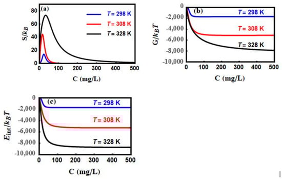 The behavior of internal energy varied as the MB concentration increased, as seen in Figure 11c. The adsorption system’s ability to release energy to the outside was designated by the negative value of internal energy, which suggested a high level of interaction between the MB molecules and the ANZ/TC/MNPs product [20,21]. Furthermore, the interface between the MB and the ANZ/TC/MNPs happened spontaneously according to the internal energy values that were negative.