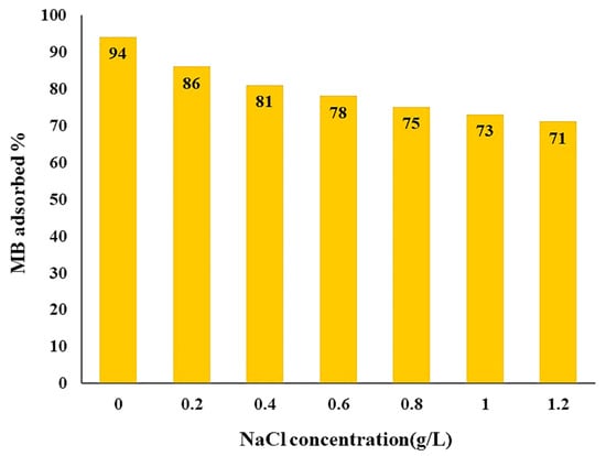 Due to the dyeing process usually being associated with a rise in salt concentration, MB adsorption onto the MNPS-G/CA was examined in relation to the amount of sodium chloride in solution. The influence of salt content on MB was investigated using 50 mL of the dye under study at a concentration of 100 mg/L and a mass of 50 mg of ANZ/TC/MNPs. Various NaCl concentrations extending between 0.2 and 1.2 g/L were employed to check the salinity impact.