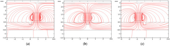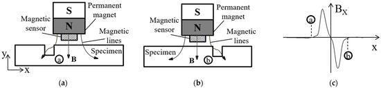 The basic principle of the novel MFL detection method is illustrated in Figure 1. The ferromagnetic specimen is magnetized by an adjacent permanent magnet. If the specimen has no defects, the magnetic flux generated by the external magnetic field remains confined within the specimen, with smooth and undisturbed flux lines. However, if the specimen contains defects, the magnetic permeability in the defect area is much lower than that of the ferromagnetic specimen, which causes a sharp increase in magnetic resistance at the defect area. As a result, the magnetic flux lines in the defect area become distorted, the magnetic field direction changes, and magnetic poles form, creating a leakage magnetic field over the defect region. Numerical simulations in Figure 2 also verify this principle. By using a magnetic-sensitive sensor to detect the MFL field, the corresponding signal can be obtained, and analyzing this signal reveals information about the defect.