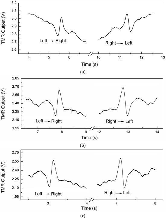 The high-precision TMR sensor (model TMR9001, provided by Multidimensional Technology Co., Ltd, Suzhou, China.) used in this study features a unique push–pull Wheatstone full-bridge structure with four highly sensitive TMR elements. It is packaged in SOP8 format (6 mm × 5 mm × 1.5 mm). The TMR9001 sensor is single-axis sensitive, with sensitivity up to 300 mV/V/Oe and typical background noise as low as 150 pT/√(Hz) at 1 Hz. Additionally, the TMR9001 offers ultra-low power consumption, excellent temperature stability, very low hysteresis, and a wide operating voltage range. It also eliminates the need for preset or reset pulse circuits, simplifying the measurement process and enhancing reliability.
