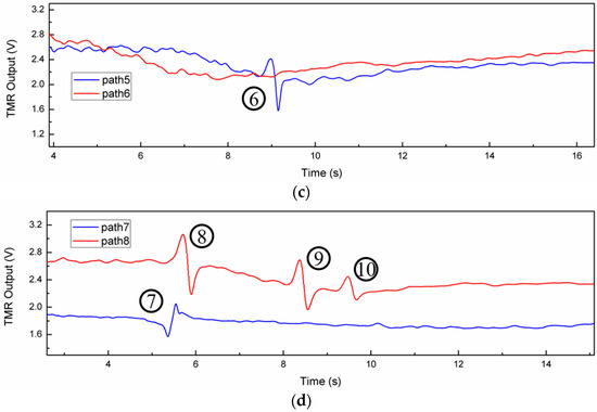 Area scanning results using a single sensor: (a) path 1 and 2; (b) path 3 and 4; (c) path 5 and 6; (d) path 7 and 8.