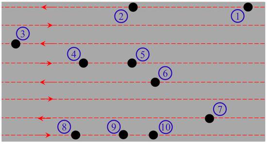 Through the analysis of each of the eight scan paths with a single probe, a total of 10 zinc dross defects were detected in the 30 × 60 mm rectangular measurement area. Based on the detection speed and the time at which the characteristic signals appeared, the exact positions of the zinc dross defects along each path can be calculated, thereby completing the position inversion of the zinc dross defects, as shown in Figure 12. Therefore, the use of array sensors allows for precise localization of inclusion defects, playing a crucial role in monitoring inclusions in industrial production. In future work, by further controlling experimental conditions and establishing a quantitative relationship between the measurement signal and the size of inclusion defects, it will be possible to obtain size information for the defects, which is highly beneficial for industrial practice.