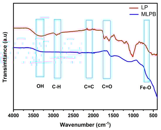 FTIR spectra of PL and MPLB are shown in Table 1 and Figure 1. Many functional groups are observed in the spectrum of the PL sample. These spectra revealed either a decrease, disappearance, or widening of the peaks following the impregnation-pyrolysis process. According to the long bandwidth around 3292 cm−1 on PL, O–H stretching vibrations of hydroxyl functional groups, including hydrogen bonds, were the predominant functional group []. Other significant peaks were found at bandwidths of 2090, 2088, 1710, 1597, and 1010 cm−1, which were attributed to the stretching vibrations of hemicelluloses [], alkyne groups [], lactones, ketones, and carboxylic anhydrides [], C=C aromatic ring vibrations from lignin [], and C–O stretching []. The FTIR spectra of MLPB (Figure 1) showed a decrease in relative intensity, which was mostly caused by the disintegration of carboxyl groups at ranges between 4000 and 2000 cm−1. At 1547 cm−1, there could be some somewhat stable aromatic molecules and/or graphitic structures, indicating some relatively stable aromatic compounds []. The strong volatile release during pyrolysis and the loss of functional groups were linked to the disappearance or shifting of observable structural characteristics []. The peak at 1010 and 1710 cm−1, which are associated with the stretching of C–O and C=O, decreased or disappeared when comparing MLPB and LP, proving that the pyrolysis process caused the hemicellulose, lignin, and cellulose that were present in the lemon peels to be depolymerized and destroyed []. In agreement with previous studies, metal–oxygen stretching frequencies usually occur between 500 and 600 cm−1 [,]; the characteristic Fe–O bond appeared at 642 cm−1 was observed.