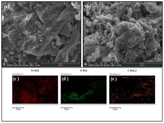 SEM images of (a) LP, (b) MLPB, and (c–e) C, O, and Fe; elemental distribution over the same region mapped per each element.