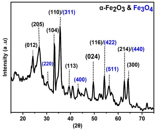 Iron oxides offer a variety of magnetic properties, which significantly depend on the shape and size of particles. These parameters, to a great extent, are governed by synthetic methods. Different methods have been reported for the preparation of magnetite nanoparticles. Here, magnetite nanoparticles were prepared and synthesized using the impregnation-pyrolysis method by pyrolyzing ground lemon peels in an oxygen-free furnace at a pyrolysis temperature of 600 °C. As a result of high temperature, particles heat up, undergo phase transformations, and some rhombohedral elementary cells of α-Fe2O3 hematite transform into Fe3O4, which were confirmed by XRD analysis []. The crystal phases of iron oxide nanoparticles were determined using the X-ray diffraction (XRD) technique. Figure 3 shows the appearance of numerous phase peaks for iron oxide in the 2θ range (0–80). The results verified the presence of characteristic peaks of both α-Fe2O3 and Fe3O4 nanoparticles on the LPB surface []. The main peaks at 24.0, 27.0, 33.40, 35.60, 40.10, 49.60, 54.02, 62.60, and 64.01 are assigned to the index at (012), (205), (104), (110), (113), (024), (116), (214), and (300), respectively. The peaks at 24.0, 33.07, 35.44, 40.78, 49.38, 54.03, 62.48, and 64.01 agreed with (JCPDS file No. 330-0664), confirming the crystallinity of (α-Fe2O3) on LPB []. The figure also shows the presence of other peaks with their indexed plane on LPB at 30.04 (220), 35.60 (311), 43.02 (400), 54.20 (422), 56.10 (511), and 62.40 (440). These peaks are also in agreement with the crystalline diffraction pattern of Fe3O4 (JCPDS file No. 75-0033) matched magnetite []. Dewage et al. [] obtained the same result by impregnating FeCl3 on pyrolyzed Douglas fir biochar.