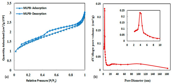 Figure 1 illustrates the MLPB hysteresis loop. The MLPB displayed type IV isotherms with an H3 hysteresis loop, which is common to mesoporous and microporous materials. (Figure 5a), according to the IUPAC classification []. It is actually true that when the temperature of pyrolysis rises over 550 °C, the size of the mesopores increases, and new micropores develop []. With a total pore volume of 0.091 cm3/g and an average pore diameter of 4.65 nm, MLPB has a surface area of 111.45 m2/g. A plot of the BJH pore size distribution is also shown in Figure 5b. The MLPB surface was found to have a mesoporous structure centered around 4 and 2.2 nm according to the BJH method (Figure 5b). The treatment process is ideal for adsorption since it has a lot of mesoporous sites [].
