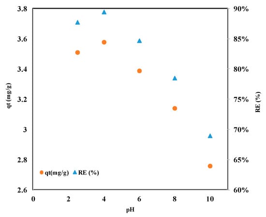 Since pH affects both the MPLB adsorbent’s surface characteristics and the MO molecules’ dissociation process in aqueous environments, adsorption processes are highly sensitive to pH levels. A pH range of 2.5 to 10.0 and an initial MO concentration of 20 mg/L were used to investigate the impact of pH on MPLB adsorption capability. The effect of pH on MPLB adsorption capacity is seen in Figure 6. The adsorption capacity of MPLB for dye adsorption slightly improves from 3.5 to 3.6 mg/g, and its removal efficiency also improves from 87.8 to 90% when the pH value is raised from 2.5 to 4.0. As the pH increases from 4 to 10, the dye adsorption and removal efficiency gradually decrease from 3.60 to 2.76 mg/g and 90 to 69%, respectively. With higher pH values, MPLB’s negatively charged surface and anionic MO’s repulsion suppress adsorption due to ionic repulsion [,]. As the MPLB adsorbent surfaces become positively charged at low pH values, more electrostatic attraction occurs between its surface and the negatively charged MO anions, increasing the capacity for adsorption. However, when the pH is very acidic, electrostatic repulsion happens between the positively charged active surface of MPLB and the protonated MO. As a result, it can be demonstrated that pH 4 is ideal for MO adsorption. The MO adsorption on magnetic AC produced similar outcomes [].