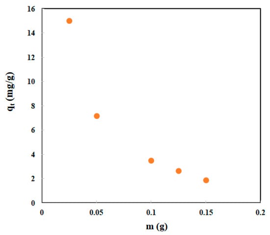 An essential parameter in adsorption studies is the amount of adsorbent used, as it determines how much dye solution will be absorbed by a given quantity of adsorbent. Figure 7 demonstrates the effect of the MLPB dose on MO adsorption, ranging from 0.025 to 1.5 g. Initially, 15 mg/g of MO adsorption capacity was observed, but it decreased to 1.9 mg/g as the initial MLPB was increased. Increased MLPB doses lead to more entanglement of the MLPB in the solution, which results in adsorption in the interlayer space and a decrease in dye aggregation at the external surface. As a result, the adsorption capacity decreased with increasing MLPB dosage. Further, high MLPB dosages can alter the physical properties of solid–liquid suspensions, such as increasing viscosity and inhibiting dye molecules’ diffusion across the surface. Because the concentration of MO was fixed, as the MLPB dosage increased, the adsorption capacity decreased [,].