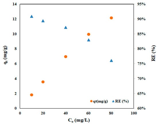 Figure 8 illustrates the effect of different MO concentrations, varying from 10 to 80 mg/L at pH 3, 0.1 g of adsorbent, and 25 °C. This figure makes it clear that the initial concentration significantly affects the MO molecules’ ability to adsorb. The qe increased by almost 6 (from 1.82 mg/g to 12.17 mg/g) with an increase in dye concentration from 10 mg/L to 100 mg/L, suggesting a linear connection between q (mg/g) and C(mg/L). Increasing the starting concentrations (Co) might explain the higher absorption capacity by amplifying the concentration gradient and facilitating the transport of MO molecules from the bulk solution to the MLPB surface. Consequently, quicker kinetics and a larger adsorption capacity are obtained by lowering the mass transfer resistance at high starting concentrations []. On the other hand, elimination efficiency decreased from 91% to 76% when the starting concentration increased from 10 mg/L to 80 mg/L. At larger starting concentrations, the adsorption sites on the surface of MLPB become saturated, which results in this behavior. Adsorption sites, therefore, become the limiting factor, while MO becomes the surplus component. Remediation efficiency is decreased with larger Co values because the MLPB surface’s ability to receive dye molecules diminishes while the number of active sites stays constant []. In order to be successful in commercial applications, initial dye concentrations should be optimized to guarantee realistic removal rates and maximize adsorption efficiency. Increasing the quantity of adsorbent to increase the number of accessible adsorption sites is one potential way to get around this restriction, as seen in Figure 8. Similar findings were documented by Kubendiran et al. [] and Han et al. [].