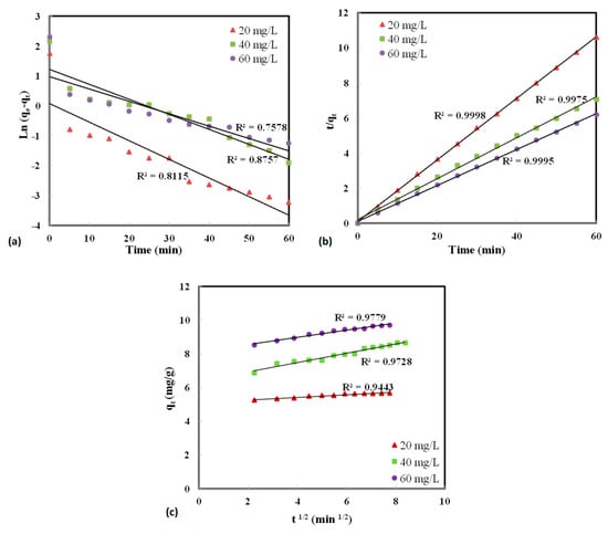 (a) Pseudo-first-order, (b) pseudo-second-order, and (c) Intraparticle diffusion kinetics plots at different initial MO concentrations.