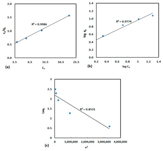 (a) Langmuir, (b) for Freundlich, and (c) Dubinin–Radushkevich (D–R) isotherms plots.