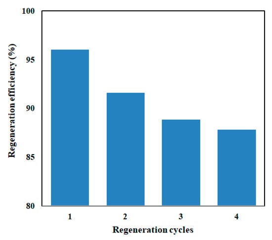 For magnetic biochar to remain viable and cost-effective over the long term, regeneration and efficiency following several adsorptions–desorption cycles are essential. The type of adsorbate and the required degree of regeneration efficiency determine the procedure to be used. The regeneration efficiency of MLPB for MO is shown in Figure 12 under four cycles. After the first adsorption–desorption cycle, 91.6% of the MO was removed by MLPB; this rate gradually declined to 87.8% after four cycles (Figure 12), which is considered an insignificant decrease. Both the breakdown of the biochar’s surface structure and the disappearance of its active mineral content may contribute to a reduction in regeneration efficacy []. Following regeneration, changes in pore size distribution, surface chemistry, and contaminant residue cause a reduction in the removal effectiveness of magnetic biochar. In order to determine the causes of this efficiency decline, characterization of the MLPB before and after regeneration using methods including BET surface area analysis, SEM, FTIR, and chemical analysis can be conducted in the future. This aids in determining the main causes of deterioration and creating plans to enhance magnetic biochar’s long-term functionality []. Accordingly, the MLPB used in the study has noticeable stability and can be reused for MO dye adsorption.