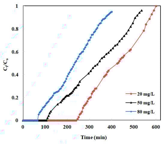 Breakthrough for MO at initial concentrations of 20, 50, and 80 mg/L.