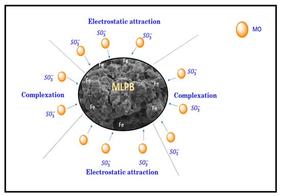 The suggested adsorption mechanism of MO by MLPB is illustrated in Figure 15. MO existed in an aqueous solution in the form of an anion (SO3−). The adsorption of MO was attained by electrostatic attraction or complexation, which mainly through the attraction between SO3− and metal ions (Fe) positively charged on the MLPB surface. This was confirmed by FTIR characterization for MLPB after adsorption of MO. Obvious changes were observed at 500–1000 cm−1, the peaks of M–O–M and O–M–O stretching, signifying the complexation between the metal ions (Fe) and SO3− groups of MO on the MLPB surface [].