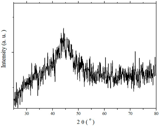 In this study, 2826MB (Fe40Ni38Mo4B18) amorphous ferromagnetic ribbons with 25 µm thickness were used in the production of microcantilevers. The amorphous ribbon used in this study was provided by Allied Company. Figure 1 presents the XRD spectrum of the ribbon, which features a broad peak characteristic of an amorphous structure. The absence of sharp peaks further confirms the completely amorphous nature of the material. The selection of 2826MB is attributed to its exceptional properties, including a high magnetoelastic coupling coefficient (0.98), high magnetic permeability (>50,000), and relatively significant magnetostriction values (12 ppm). In our case, we used the Sodick AP250L (Schaumburg, IL, USA) Wire EDM system to cut the MC sensors to the specified design. We believe this is the first time an EDM system has been used for MC production within the scope of this study.