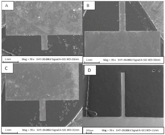 SEM pictures of some MCs. The dimensions of the MCs vary across the figures as follows: in Figure (A), it is 1000 µm long and 400 µm wide; in Figure (B), it is 2000 µm long and 400 µm wide; in Figure (C), it is 1200 µm long and 400 µm wide; and in Figure (D), it is 2000 µm long and 160 µm wide.