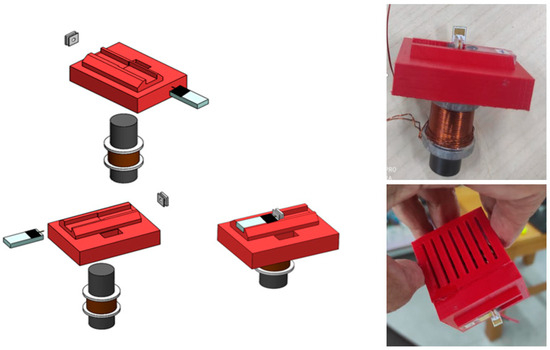 We think, before delving into the details of the measurement system, it is important to first explain the MC unit. As shown in Figure 4, the MC must be positioned precisely and centrally within the pickup coil. Initially, both the MC and the pickup coil were attached to a manually controlled micropositioner capable of three-dimensional movement, and measurements were taken accordingly. However, this process was time-consuming and labor-intensive. To address this, we designed the system shown in Figure 4. In this design, the pickup coil is fixed in place near the center of the channel. The MC is attached to a rectangular piece of transparent plastic using various strong adhesives, such as “West Epoxy 105-206”, which is also used in other applications involving amorphous ribbons. The MC, once glued to the plastic piece, can move freely within the channel. Due to the slight reverse incline of the channel, the MC does not fall out even when the system is inverted. The dimensions of the channel and the plastic piece holding the MC are precisely adjusted, so that when the MC is moved toward the pickup coil, it aligns perfectly with the center of the coil (as shown in Figure 4). To induce vibrations in the sample, a small electromagnet is placed directly beneath the pickup coil, positioned as closely as possible. The core of this electromagnet is made of soft magnetic material, and the driver coil consists of 200 turns. The driver coil is powered by an AC signal, which generates an AC magnetic field applied to the MC. The magnetic core diameter was varied between 0.3 mm and 10 mm, with the final choice being a core with a diameter of 0.8 mm. Figure 4 also includes images of the MC holder system, which is part of this design. The reference sensor used for humidity measurements is visible on the side in these images. In the final version of the MC measurement system, the electromagnet component was enclosed in a box with three connectors on the side: the output for the pickup coil, the input for the electromagnet driver coil, and the output for the reference sensor. The reference sensor is used to measure the ambient pressure, temperature, and humidity with an Arduino.
