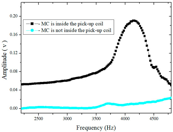 First, to test whether the measured signal in Figure 5 originated from the sample, we measured the signal as a function of frequency with and without the MC in the pickup coil. As shown in Figure 5, no distinct peak was observed when the MC was not in the sample. However, when the MC was placed in the pickup coil, and a frequency scan was performed, a very clear peak was observed at around 4200 Hz, corresponding to the resonance frequency of the MC. In the MC resonance frequency measurements, we generally used thickness values between 6 and 10 µm, and the sample length was varied from 1000 µm to 2000 µm. In Figure 6, Figure 7 and Figure 8, the resonance curves of MCs with different lengths and the effect of the applied external magnetic field can be seen.