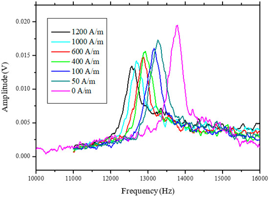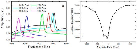 The change in the resonance frequency and vibration amplitude of the MC as a function of the magnetic field is shown in Figure 6 and Figure 7. The change in resonance frequency with the magnetic field is given by [30]