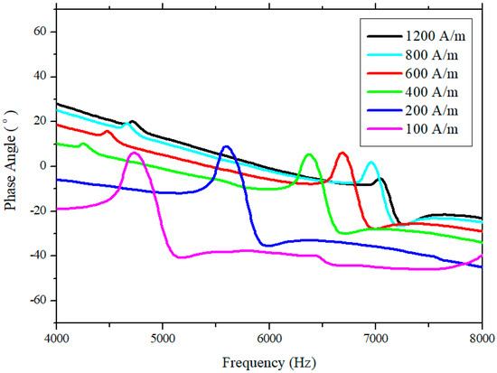 Measurement of the sample’s resonance frequency using phase angle. The resonance frequency was measured at different magnetic field values between 100 and 1200 A/m.