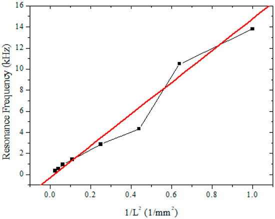 In the measurements conducted, the resonance frequency of the MC with a length of 1000 µm was found to be around 13.8 kHz. The resonance frequency was measured for MCs of different lengths, and the variation in resonance frequency with sample length is presented in Figure 9. According to Equation (1), the sample’s resonance frequency is proportional to 1/L2;, meaning that as the sample length decreases, the resonance frequency increases. This is consistent with the resonance frequency variation in the MCs we produced, which depends on the sample length. We also investigated the resonance frequency of the 1500 µm long MC by measuring the phase angle. It was observed that the resonance frequencies obtained from phase measurements were consistent with those obtained from amplitude measurements (Figure 6 and Figure 8).