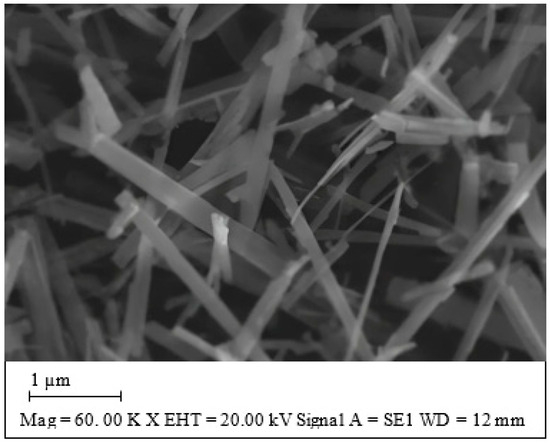 TiO2-based nanotubes (NTs) were synthesized through a hydrothermal method. Initially, TiO2 nanopowder (TiO2 NP) was prepared using a reflux technique. Titanium isopropoxide (Ti(OPri)4, 97%; Alpha, Waltham, MA, USA) served as the precursor and was dissolved in 2-propanol (99.5%, Sigma Aldrich, St Louis, MO, USA) at a 10:1 molar ratio of 2-PrOH to Ti(OPri)4. This mixture, referred to as solution A, was stirred at 800 rpm for 15 min at room temperature. Meanwhile, water and sulphuric acid were mixed with Ti(OPri)4 at molar ratios of 10:1 and 0.01:1, respectively, to create solution B, which was also stirred at 800 rpm for 30 min. Solution A was then added drop by drop to solution B while maintaining continuous stirring at 800 rpm for 30 min to achieve a homogeneous mixture. This mixture was then refluxed at 110 °C for 6 h to synthesize the TiO2 NP. The product was centrifuged to remove solvents and dried at 80 °C in a vacuum oven for 8 h to obtain the anatase phase of titania. To create the TiO2-based NTs, 2 g of the TiO2 NP was ultrasonically dispersed in 40 mL of 10 M NaOH and subjected to hydrothermal treatment at 180 °C for 48 h in a Teflon-lined autoclave. The resulting solid phase was washed with 0.1 M HCl and distilled water until the pH was between 6 and 7. Finally, the filtered TiO2-based NTs were dried at 80 °C for 8 h. SEM images of the TiO2-based NTs are shown in Figure 10. The images reveal clusters of TiO2-based NTs, with many of the samples appearing translucent. As a result, the samples beneath the top layer are often visible, which is significant, as it confirms that the majority of the structures are tubular. The characterization and properties of the TiO2 NTs can be seen in detail in our previous studies [32,33].
