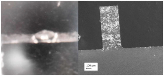 During the MC production process, amorphous ribbons in roll form were cut and prepared into 2 cm × 2 cm pieces. These strips were then stacked on top of each other and compressed between plates using a bolted system. The desired number of amorphous strips can be stacked in this manner, and the number of 2 cm × 2 cm strips used indicates the quantity of MC produced in a single run. We produced approximately 100 MCs in a single run. MCs were produced in different sizes by varying their length from 20,000 µm to 1000 µm and their width from 400 µm to 100 µm. Figure 2 shows the SEM images of the MCs produced with the EDM device. The diameter of the conductive brass wire used for cutting in the EDM device is 100 µm. This is the smallest diameter wire that can be used in the system. It was observed that MCs were generally produced with a fairly smooth and desired size. The chemical etching process was applied to reduce MC thickness and to prepare the solution. We used the chemicals and ratios provided below: