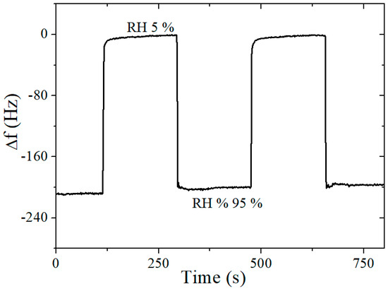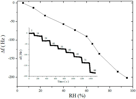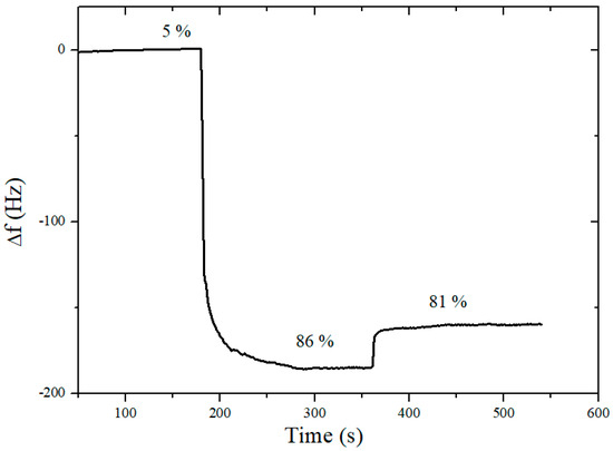 The response of the sensors to static humidity detection is presented in Figure 14. Different humidity levels were achieved by adjusting the gas flow using a flow meter. During the measurements shown in Figure 14, the frequency corresponding to the sensor at 5% RH was used as a reference point, and frequency shifts were calculated relative to this baseline. Figure 14 also highlights the sensor’s exceptional sensitivity in detecting even minor changes in humidity. Furthermore, the inset in Figure 13 illustrates the variation in the sensor’s resonance frequency as a function of the humidity level within the cabin. The data reveal a linear decrease in resonance frequency up to 60% RH, after which a sharp and more significant drop is observed.
