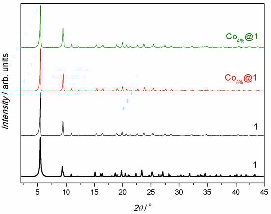 Polycrystalline samples of 1, Co4%@1, and Co8%@1 were introduced into a 0.5 mm borosilicate capillary prior to being mounted and aligned on an Empyrean PANalytical powder diffractometer, manufactured by PANalytical, Almelo, The Netherlands, using Cu Kα radiation (λ = 1.54056 Å). Five repeated measurements were collected at room temperature (2θ = 2–45°) and merged in a single diffractogram.
