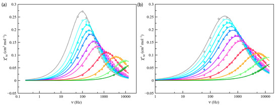 Frequency dependence of χM′′ for Co4%@1 (a) and Co8%@1 (b) under applied static field of 2500 G with a +5.0 G oscillating field in the temperature range of 2–8 K (from grey to green). The solid lines represent the best-fit curves simulated using the generalized Debye model.