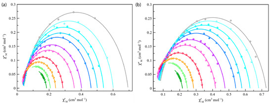 Cole–Cole plots of Co4%@1 (a) and Co8%@1 (b) at 2–8 K (from grey to green) under applied static field of 2500 G. The solid lines represent the best-fit curves.