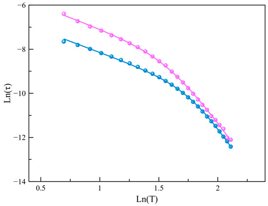 The lnτ versus lnT plot for the calculated magnetic relaxation times of Co4%@1 (pink) and Co8%@1 (blue) under an applied static field of 2500 G. The solid lines represent the best-fit curves.